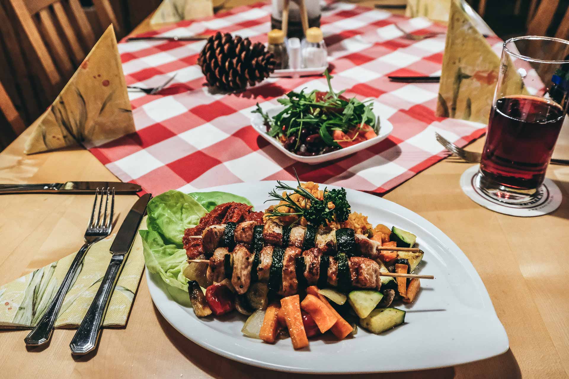 - Putenspieße mit Grillgemüse, Tomatenreis und gemischtem Salatteller